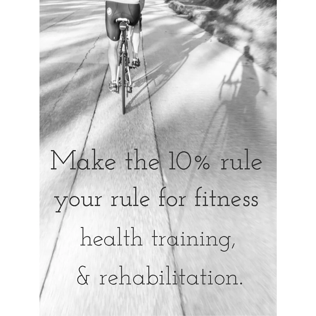 The 10% is a golden rule in health and fitness training to prevent injury, but it also applied to rehabilitation and recovering from an injury. Simply put: in a given week, you shouldn't increase the challenge you put on your body by more than 10%.